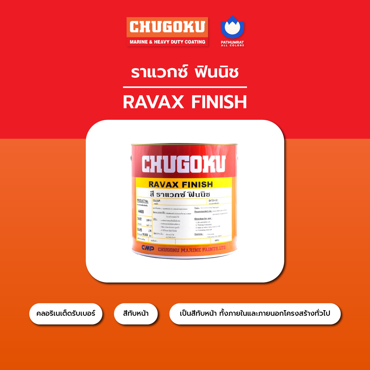 สีชูโกกุ สีทาเรือ สีอุตสาหกรรม สีทนความร้อน สีกันเพรียง สีชูโกกุ สีที่ทนต่อการกัดกร่อนสีน้ำทะเล Chugoku Marine Paints, Ltd. , Japan (มีประสบการณ์มากกว่า 100 ปี) ในการผลิตสีเคลือบทางทะเล, เคลือบหนัก, การเคลือบอุตสาหกรรมการเคลือบภาชนะและการเคลือบไม้ในประเทศไทยและขยายมาตรฐานและคุณภาพเดียวกันในประเทศญี่ปุ่นสู่ภูมิภาคนี้โดยใช้เทคโนโลยีระดับมืออาชีพของ