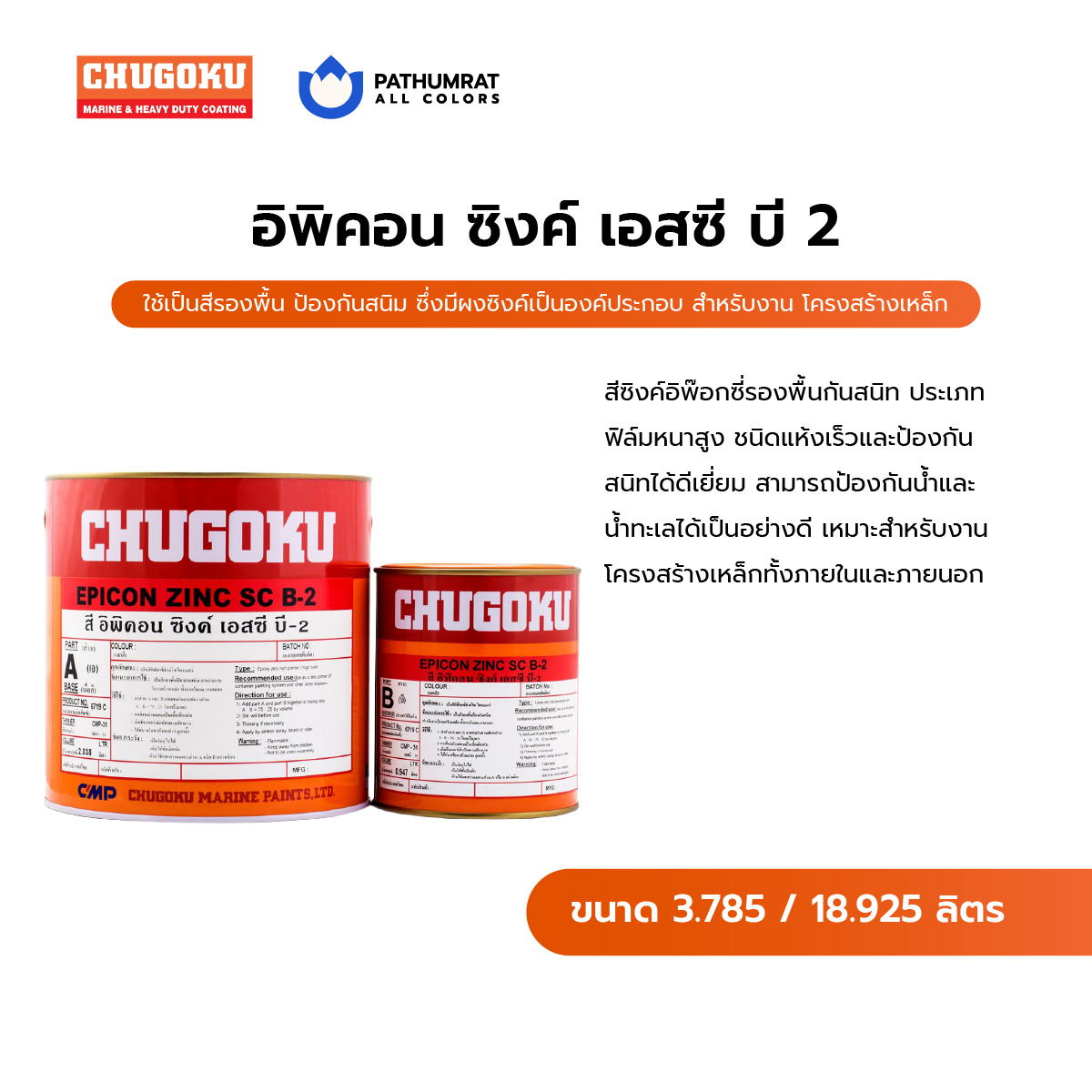 สีซิงค์อิพ๊อกซี่รองพื้นกันสนิท ประเภทฟิล์มหนาสูง ชนิดแห้งเร็วและป้องกันสนิทได้ดีเยี่ยม สามารถป้องกันน้ำและน้ำทะเลได้เป็นอย่างดี เหมาะสำหรับงานโครงสร้างเหล็กทั้งภายในและภายนอก